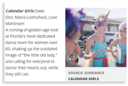 "Calendar Girl" documentary featured at Sundance Film Festivals, and film festivals all over the globe. Won numerous awards and was a highlight film on American Airlines entertainment channel.
